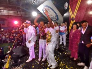 E na voz do Rouxinol Oficial da Escola, Royce do Cavaco, e ao ritmo da bateria com Identidade, do mestre Rafa, a Roseira entoou o hino oficial em uníssono de forma contagiante.